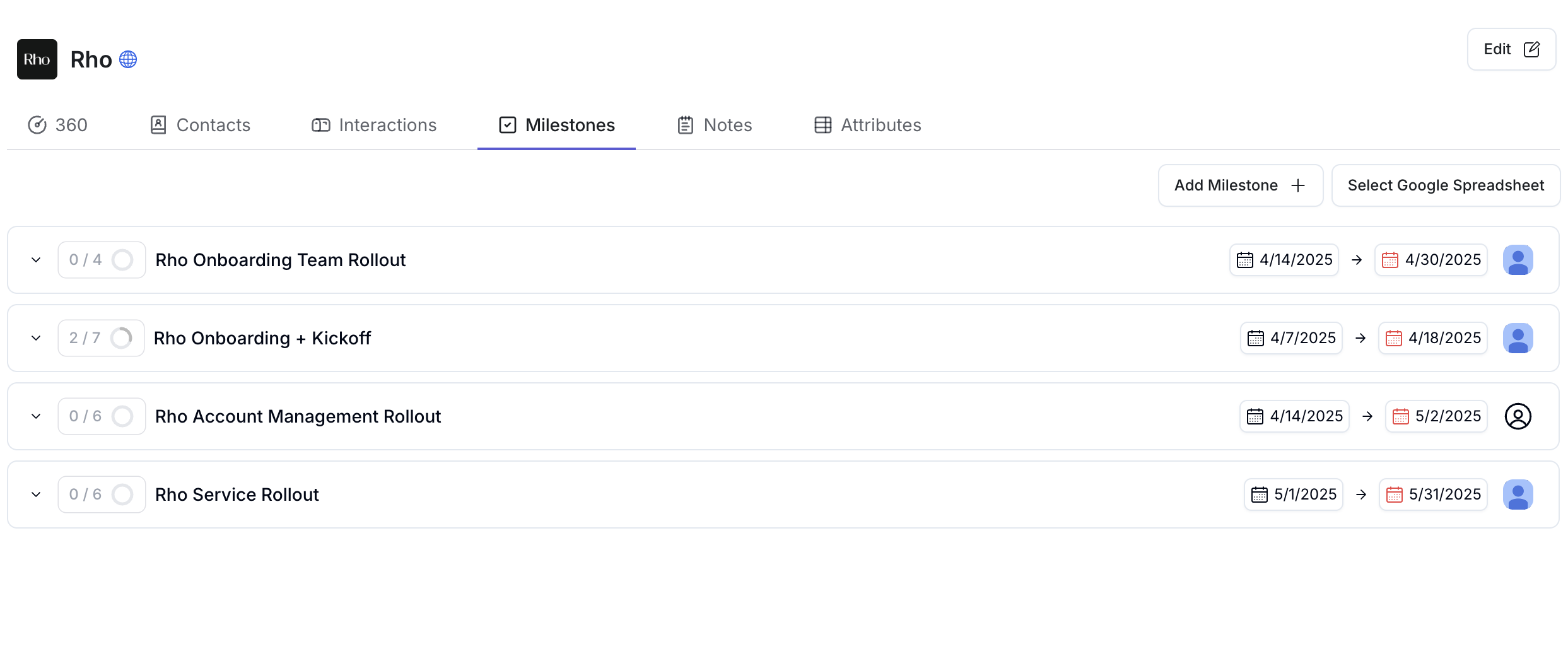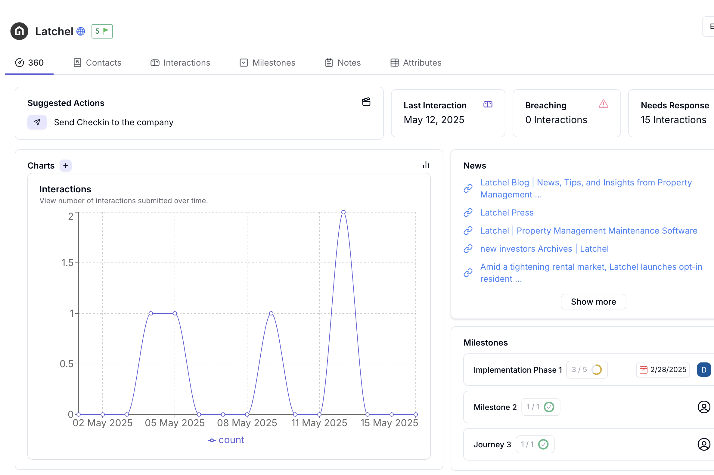 The account interactions page displays all of the communication (outbound or inbound), across all channels, that you have had with the account. Easily view open support tickets, escalated bugs, and more.Milestones