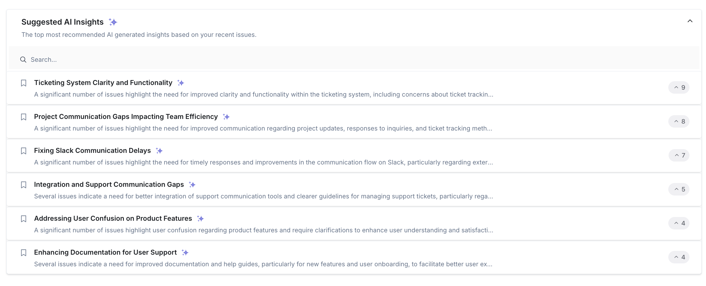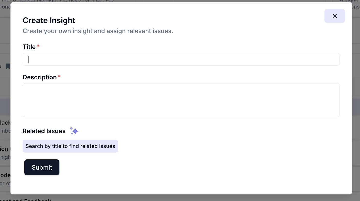 Type in the title of the insight and add a detailed description if possible! To attach existing support interactions to this insight, click the “related issues” button and manually search + add tickets to this insight. Or.. click the “sparkle” icon to use AI to link issues based on the description for you! Once you save this insight, any new support interactions that match the description of the insight will automatically be linked.