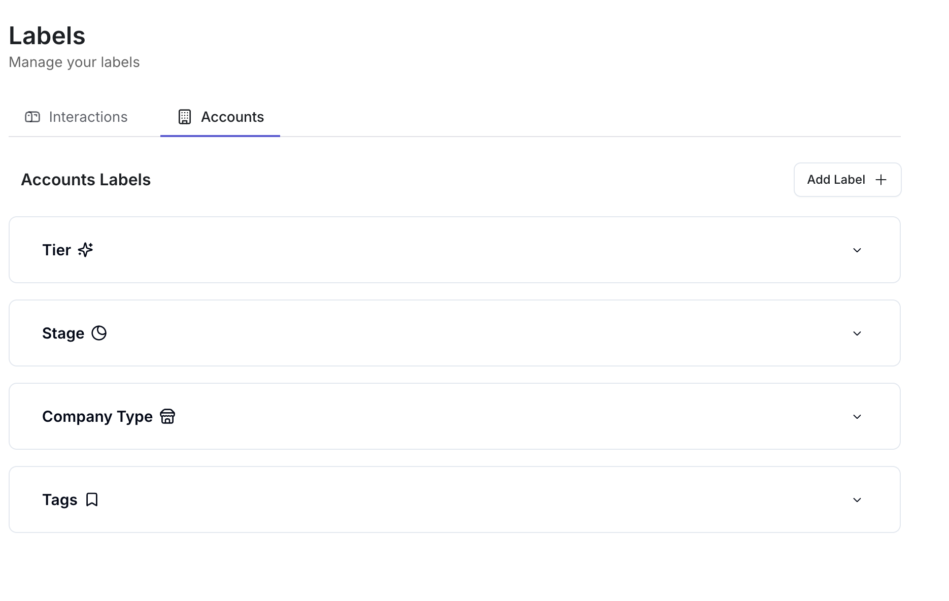 Tier: the payment method Stage: where the user is in the post-sale lifecycle (onboarding, live, etc) Company: “size” of the client Tags: entirely custom. You may add / edit any of these labels by clicking the “+ Add Label button”